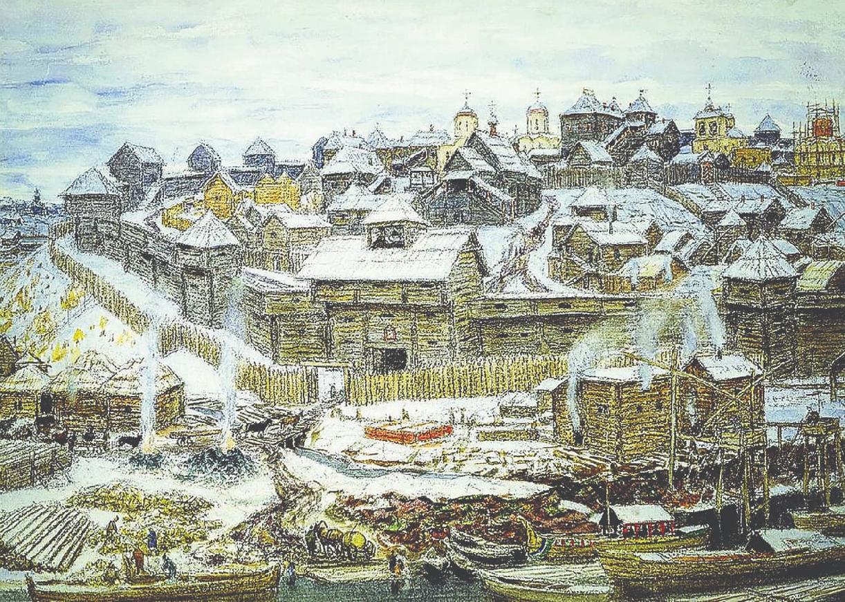 А.М. Васнецов. Московский Кремль при Иване Калите. Бумага на картоне, акварель, карандаш, уголь. 1921 год. Музей Москвы